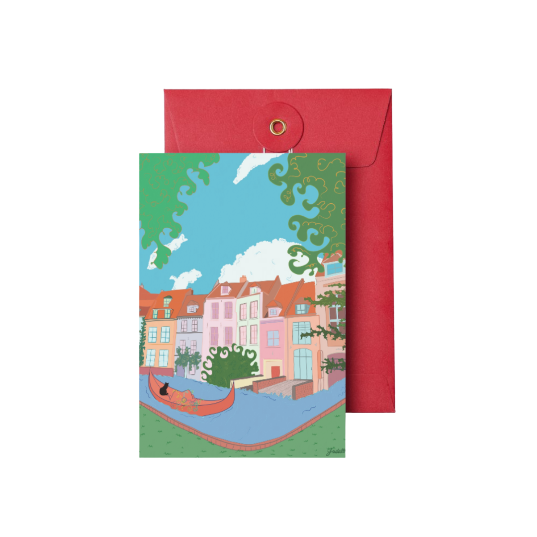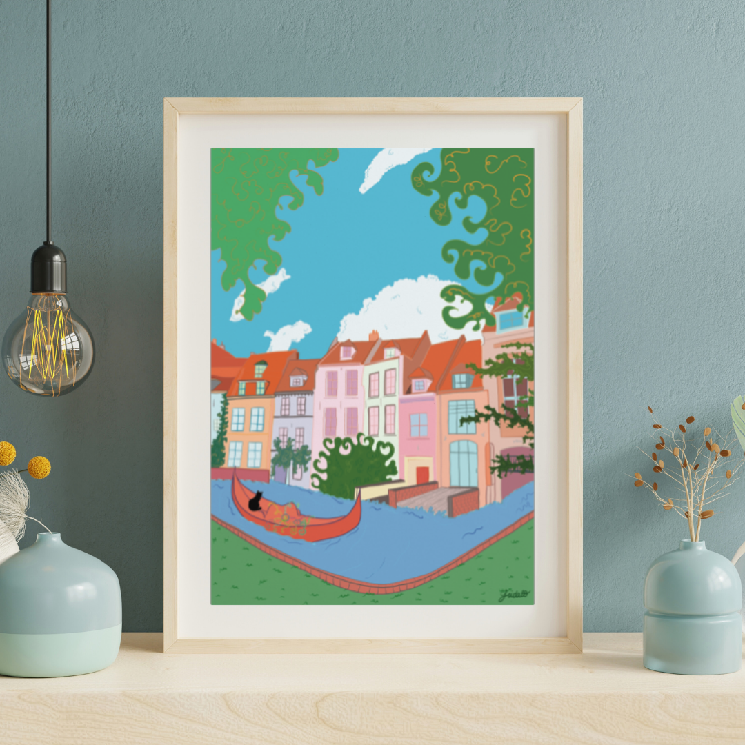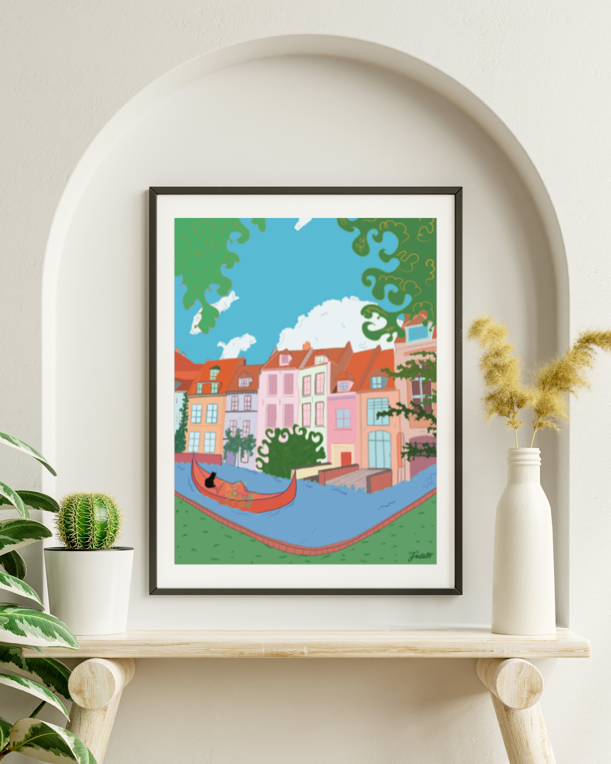 J’ai imaginé la place Gilleson comme un petit coin de Venise du Nord, où mon chat, curieux et rêveur, vogue en gondole entre les reflets colorés des façades.